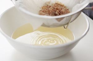 ザルにキッチンペーパーなどを敷いておき、②を静かに漉す。